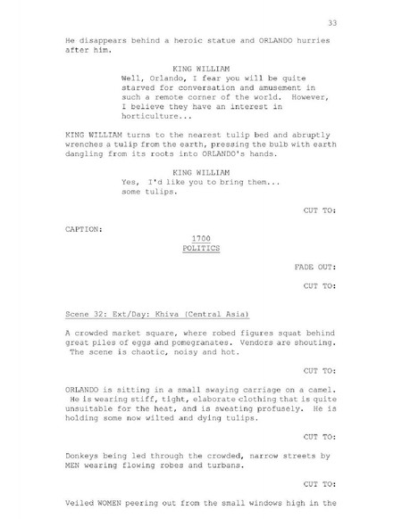 Research for a paper on Orlando\'s relocation of Woolf\'s Constantinople to Khiva, exploring the subtexts of imperial history and the significance of travel for the film (and the production). "endings are beginnings": the novel is circular, beginning and ending with "home." The film is also circular, but moves on from the "clinging to the past" that Potter notes. For Woolf, Home is the "Great House" (and England), which Orlando possesses despite her change of sex, a reversal of the gendered laws that deprived Vita Sackville-West of Knole. But Sackville-West was also a traveller, and travel writer, and the novel is full of constant motion (at least until Orlando becomes female). The film suggests the novel's subtext of change as constant.