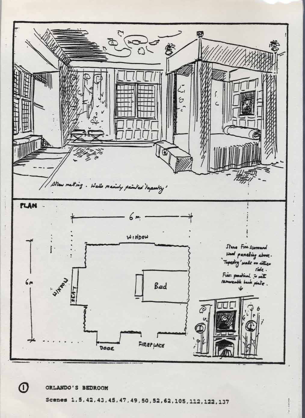 Description Page 1 of set design sketches showing Orlando's bedroom. Black ink on white A4