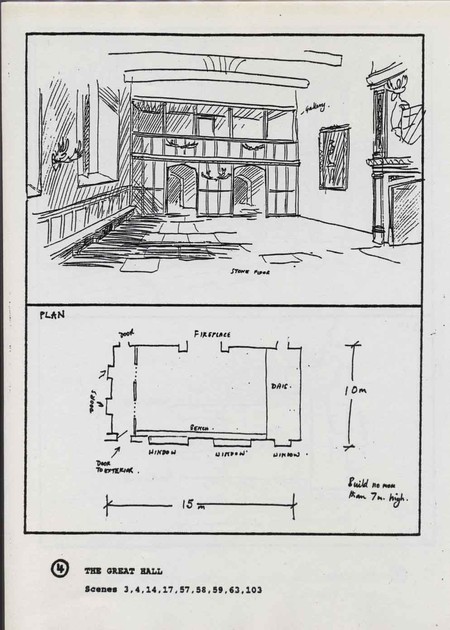 Description Page 4 of set design sketches showing the Great Hall. Black ink on white A4