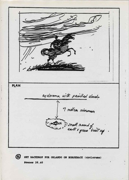 Description Page 16 of set design sketches showing backdrop for Orlando on horseback. Black ink on white A4