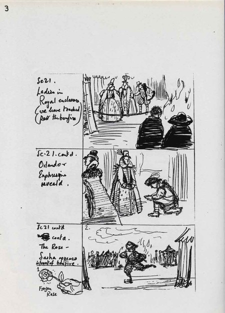 Description Page 3 of main sequence storyboards showing ladies in the Royal enclosure (England), Orlando and Euphrosyne, Sasha in front of the bonfire, handdrawn in black ink on white A4.