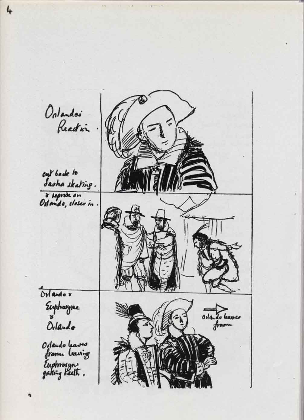 Description Page 4 of main sequence storyboards showing Orlando's reaction to Sasha skating, and Orlando with Euphrosyne, handdrawn in black ink on white A4.