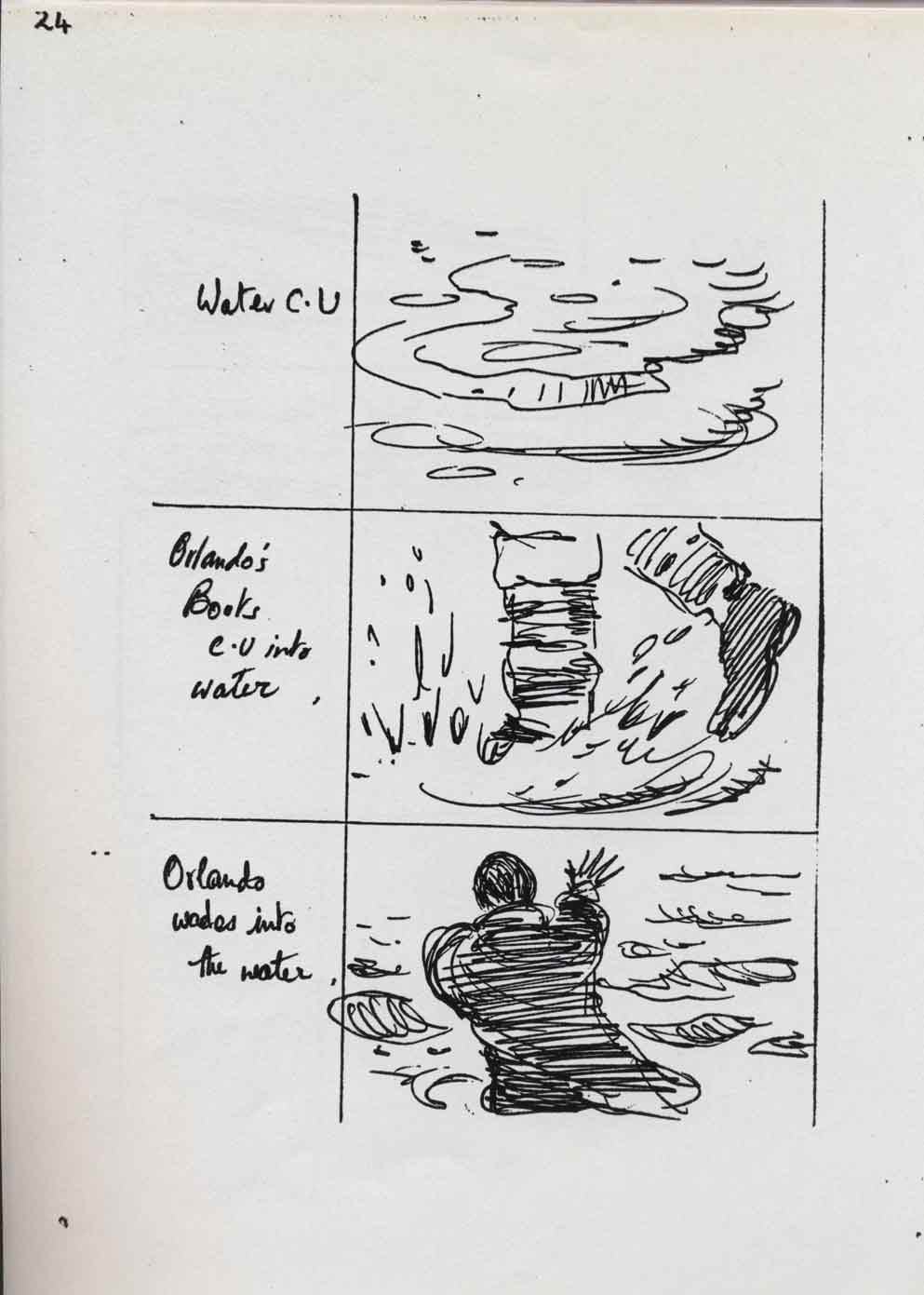 Description Page 24 of main sequence storyboards showing Orlando wading into the water, handdrawn in black ink on white A4.