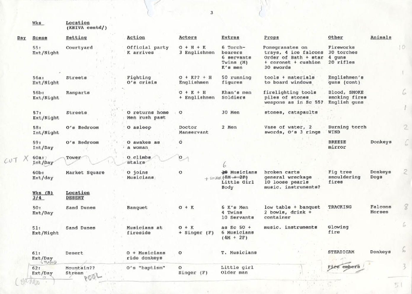 Description A4 computer paper with handwritten notes, Paper, Shooting schedule for Khiva, continued