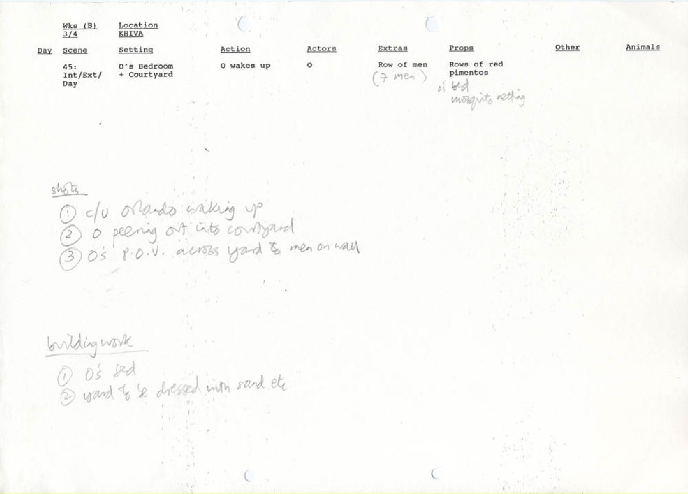 Description A4 computer paper with handwritten notes, Paper, Shooting schedule Khiva, scene 45