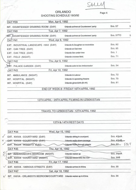 Description A4 computer paper with handwritten notes, Paper, One line shooting schedule, London, Khiva
